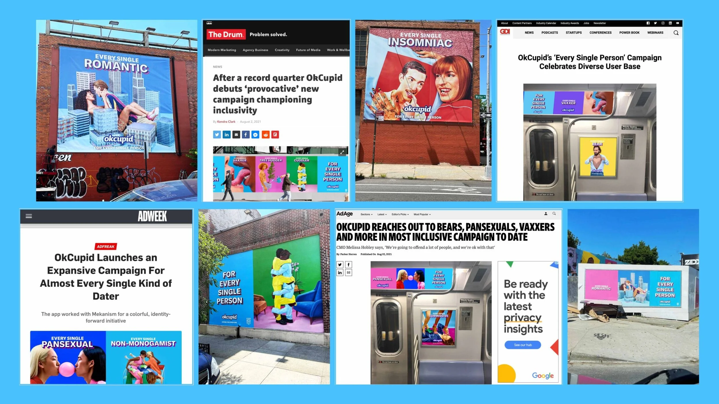 OkCupid wanted to announce itself as the most radically inclusive dating app, with more ways to identify yourself and what you are looking for than any other. We took that challenge head on, working with Maurizio Cattelan and Pierpaolo Ferrari to create a truly disruptive and empowering campaign that took over post-pandemic New York, Chicago and Los Angeles.